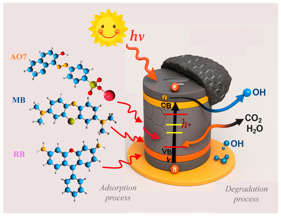 The rapid global expansion of the chemical and electronics industries has contributed to significant environmental problems [1]. The effective removal of organic pollutants from wastewater remains one of the most pressing problems in environmental chemistry. In this context, photocatalysis has emerged as a promising approach to combat pollution through the photodegradation of organic compounds [2,3,4]. Among various materials, titanium dioxide (TiO2, titania) has been widely used as a powerful photocatalyst. Both in the form of nanoparticles and nanotubes, it showed promising applications for the photocatalytic removal of pollutants (dyes, phenols, etc.) from aqueous media [5]. However, their effectiveness in environmental remediation is limited by their low efficiency in visible light and the rapid recombination of electron–hole pairs [6]. Titanium dioxide-based composites have attracted considerable attention in environmental research due to their favorable properties, including thermal stability, low cost, and non-toxicity [7,8,9]. Nevertheless, the wide band gap of TiO2 (3.2 eV), which limits its activity in visible light, is a significant obstacle to its wider industrial application [10,11]. Therefore, improving the light-collecting ability and extending the lifetime of the charge carriers generated by the light are crucial for enhancing the photocatalytic degradation of organic dyes with titania-based materials. Numerous modification strategies have been explored to overcome these limitations and enhance the photocatalytic performance of TiO2, e.g., doping and coupling in composites with other semiconductors, conductive polymers, carbon materials, etc. [6,12,13,14,15,16].