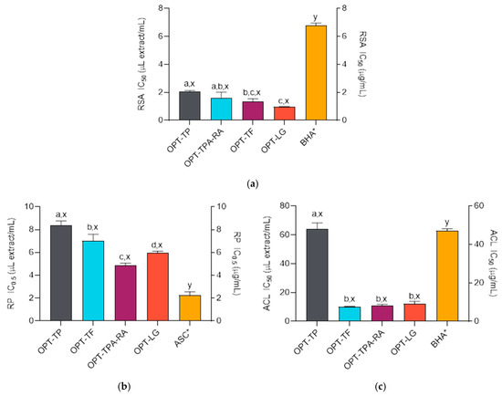 Radical scavenging activities (RSA) (a), reducing powers (RP) (b), and activities in the β-carotene-linoleic acid assay (ACL) (c) of S. montana extracts (prepared as described in Table 2) and the positive controls, BHA (butylated hydroxyanisole) and ASC (ascorbic acid). a,b,c,d Differences between the extracts (ANOVA followed by Tukey’s post-test, p < 0.05). x,y Differences from the positive control (ANOVA followed by Dunnett’s post-test, p < 0.05). Columns not connected with the same letters are statistically different. The asterisk indicates that the result is plotted on the right ordinate. The details of the IC50 and IC0.5 values calculations are given in the respective subsections of the Section 3.