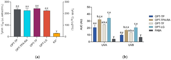 Tyrosinase inhibitory activity (TyInh) (a) and areas under curves (AUC) for UV spectra in the UVA and UVB regions (b) of the S. montana extracts (prepared as described in Table 2) and the positive controls KA (kojic acid) and 1 mg/mL p-aminobenzoic acid (PABA) solution in a 1:64 dilution. a,b,c Differences between the extracts (ANOVA followed by Tukey’s post-test, p < 0.05). x,y Differences from the positive control (ANOVA followed by Dunnett’s post-test, p < 0.05). Columns not connected with the same letters are statistically different. The asterisk indicates that the dataset is plotted on the right ordinate. The details of the IC50 values calculations are given in the respective subsections of the Section 3.