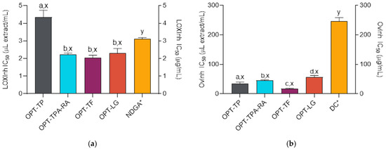 Lipoxygenase (LOX) (a) and ovalbumin coagulation inhibitory (OvInh) (b) activities of the S. montana extracts (prepared as described in Table 2) and the positive controls NDGA (nordihydroguaiaretic acid) and DF (diclofenac). a,b,c,d Differences between the extracts (ANOVA followed by Tukey’s post-test, p < 0.05). x,y Differences from the positive control (ANOVA followed by Dunnett’s post-test, p < 0.05). Columns not connected with the same letters are statistically different. The asterisk indicates that the dataset is plotted on the right ordinate. The details of the IC50 values calculations are given in the respective subsections of the Section 3.
