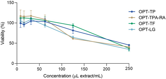 The cell viability was determined using the MTT test [72] and compared to untreated cells incubated in HBSS (the negative control). HaCaT cells were seeded onto the 96-well plates at a density of 2 × 104 cells/well and incubated to reach confluence. After 24 h, the cell culture medium was removed and the cells were washed with HBSS. The extracts, previously diluted with HBSS, were used to treat the cells for 2 h. Thereafter, the cells were washed twice with HBSS and incubated with a fresh medium (100 µL/well). After 24 h, 20 µL of the MTT solution (2.5 mg/mL) was added to each well, and the plates were incubated at 37 °C. After 1 h, the medium was removed and the cells were lysed. The formazan formed in the reaction was dissolved with acidic isopropanol, and the absorbance at 570 nm was measured. The metabolic activity was expressed relative to the negative control.