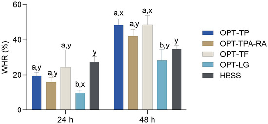 HaCaT cells were cultured in 24-well plates at a density of 105 cells per well [72], with a total volume of 500 µL per well. The cells were allowed to achieve sufficient confluence over a 24-h period in a DMEM medium enriched with 10% FBS and antibiotics. Following this incubation, the medium was discarded and substituted with a serum-free medium. After an additional 24 h, a sterile 10 µL pipette tip was employed to create a “wound” by scraping across the surface of each well, resulting in a cell-free area. The cell monolayer was subsequently washed gently with HBSS to eliminate any detached cells and debris. The wounds were then treated with extract solutions in HBSS for a duration of 2 h. Each well was marked beneath the plate to facilitate the identification of the same scratched area. After the 2-h treatment, the cells were washed again with HBSS and incubated with 500 µL of the serum-free medium per well. Wounds treated solely with HBSS served as the negative control. The in vitro epithelialization of the wounds was observed over 48-h period, with assessments made every 24 h using phase-contrast microscopy at a 10× magnification. The scratch area was quantified using ImageJ software 1.54c (National Institutes of Health, Bethesda, MD, USA), and the wound-healing rate (WHR) was calculated as the percentage of scratch closure relative to the initial scratch area, in accordance with Equation (6):