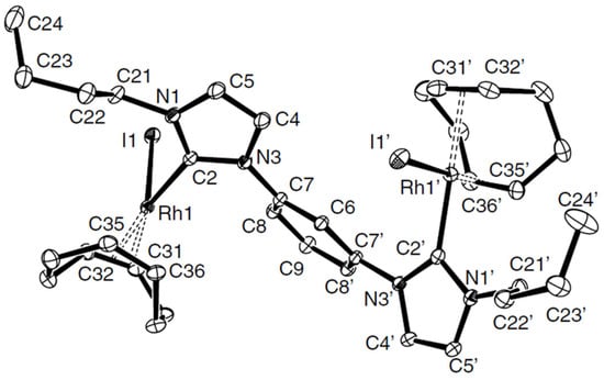 - Poyatos, M.; Mas-Marzá, E.; Mata, J.A.; Sanaú, M.; Peris, E. Synthesis, Reactivity, Crystal Structures and Catalytic Activity of New Chelating Bisimidazolium-Carbene Complexes of Rh. Eur. J. Inorg. Chem. 2003, 2003, 1215–1221. [Google Scholar] [CrossRef]