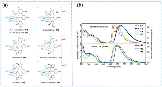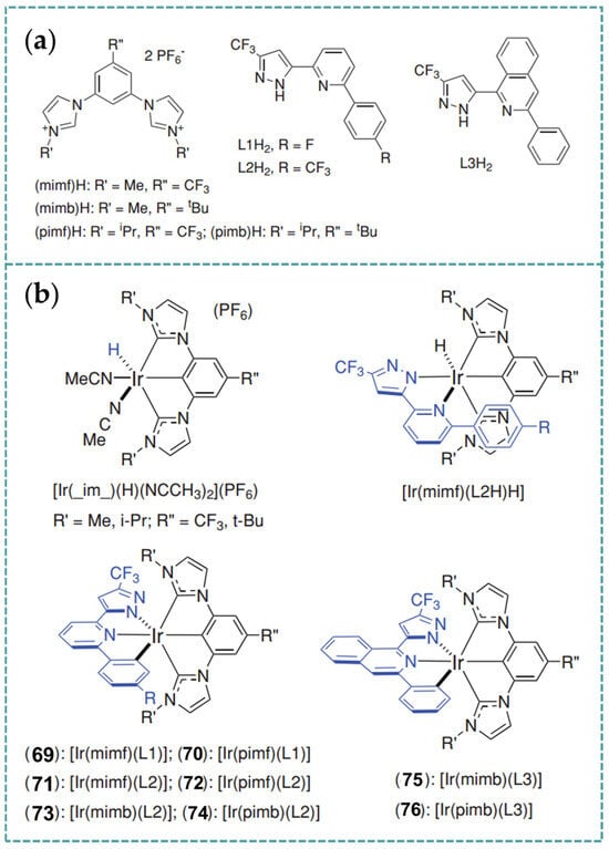 - Darmawan, N.; Yang, C.-H.; Mauro, M.; Raynal, M.; Heun, S.; Pan, J.; Buchholz, H.; Braunstein, P.; De Cola, L. Efficient Near-UV Emitters Based on Cationic Bis-Pincer Iridium(III) Carbene Complexes. Inorg. Chem. 2013, 52, 10756–10765. [Google Scholar] [CrossRef]