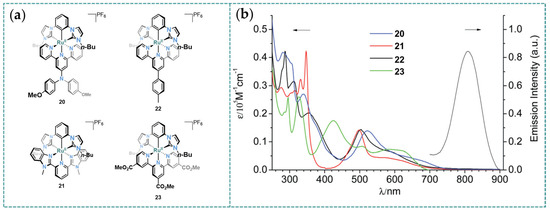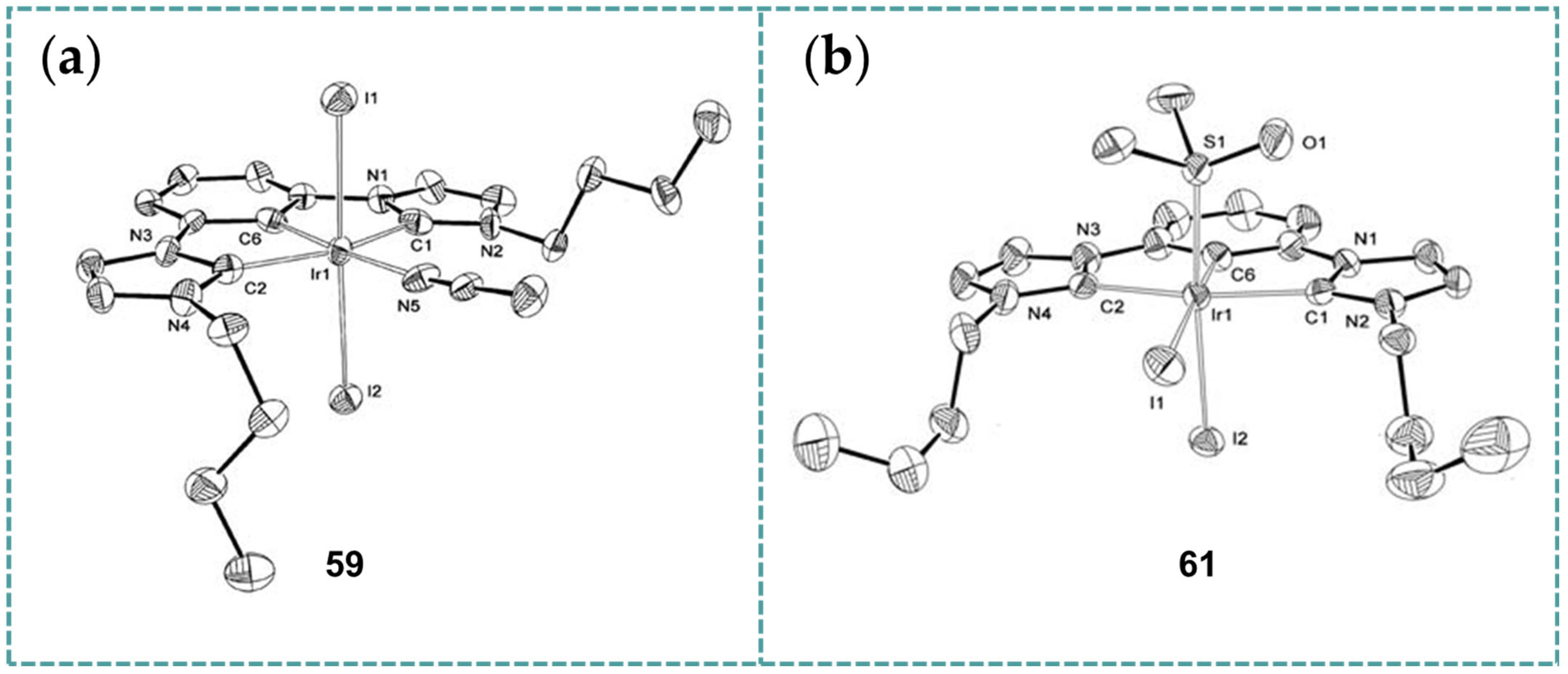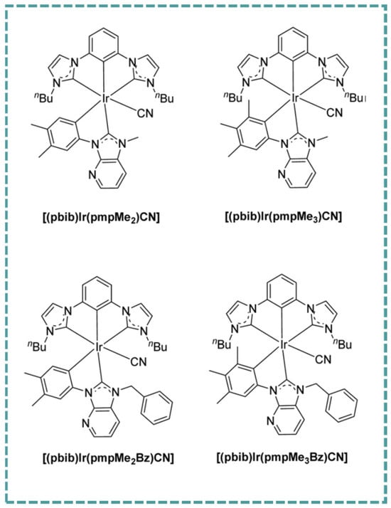 - Amouri, H. Luminescent Complexes of Platinum, Iridium, and Coinage Metals Containing N-Heterocyclic Carbene Ligands: Design, Structural Diversity, and Photophysical Properties. Chem. Rev. 2023, 123, 230–270. [Google Scholar] [CrossRef]