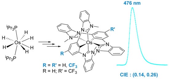 - Alabau, R.G.; Eguillor, B.; Esler, J.; Esteruelas, M.A.; Oliván, M.; Oñate, E.; Tsai, J.-Y.; Xia, C. CCC-Pincer-NHC Osmium Complexes: New Types of Blue-Green Emissive Neutral Compounds for Organic Light-Emitting Devices (OLEDs). Organometallics 2014, 33, 5582–5596. [Google Scholar] [CrossRef]