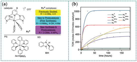- Das, S.; Rodrigues, R.R.; Lamb, R.W.; Qu, F.; Reinheimer, E.; Boudreaux, C.M.; Webster, C.E.; Delcamp, J.H.; Papish, E.T. Highly Active Ruthenium CNC Pincer Photocatalysts for Visible-Light-Driven Carbon Dioxide Reduction. Inorg. Chem. 2019, 58, 8012–8020. [Google Scholar] [CrossRef] [PubMed]
