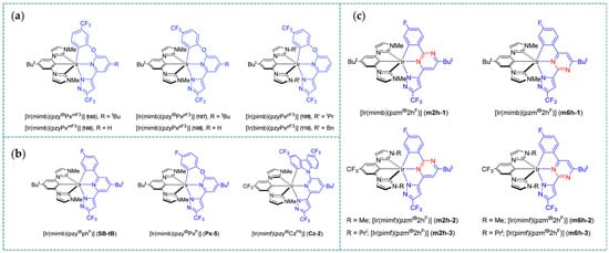 - Hsu, L.-Y.; Chen, D.-G.; Liu, S.-H.; Chiu, T.-Y.; Chang, C.-H.; Jen, A.K.Y.; Chou, P.-T.; Chi, Y. Roles of Ancillary Chelates and Overall Charges of Bis-tridentate Ir(III) Phosphors for OLED Applications. ACS Appl. Mater. Interfaces 2020, 12, 1084–1093. [Google Scholar] [CrossRef]