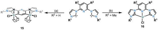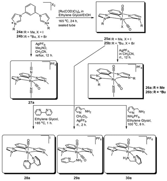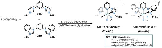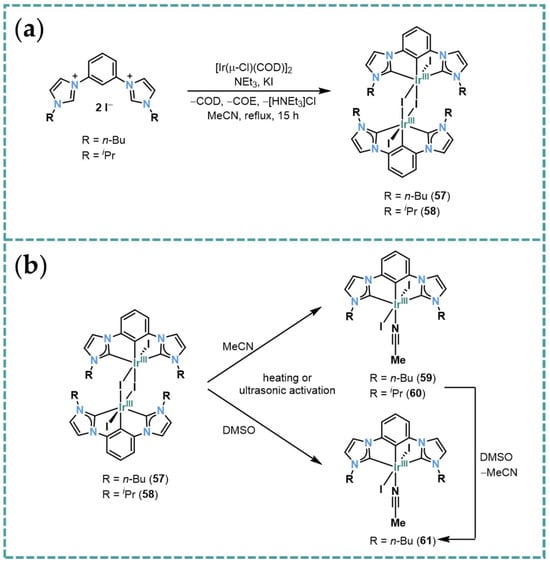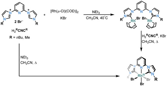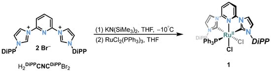 - Danopoulos, A.A.; Braunstein, P.; Saßmannshausen, J.; Pugh, D.; Wright, J.A. “Pincer” Pyridine-Dicarbene-Iridium and -Ruthenium Complexes and Derivatives Thereof. Eur. J. Inorg. Chem. 2020, 2020, 3359–3369. [Google Scholar] [CrossRef]