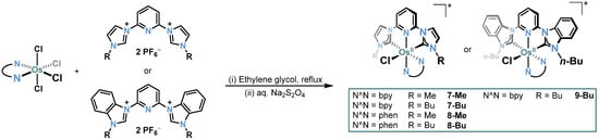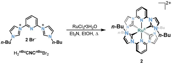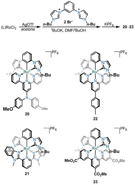 - Park, H.-J.; Chung, Y.K. Ru(II) complexes with N-Heterocyclic carbene ligands or terpyridine analogues: Synthesis, characterization, and electrochemical and proton-dependent spectrometric properties. Dalton Trans. 2012, 41, 5678–5686. [Google Scholar] [CrossRef]