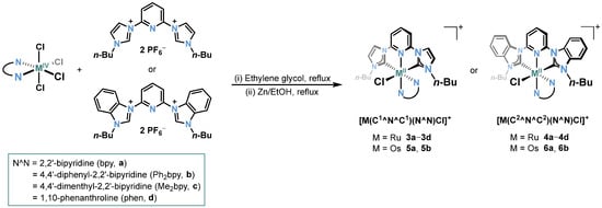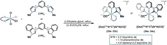- Wong, C.-Y.; Lai, L.-M.; Pat, P.-K.; Chung, L.-H. Osmium Complexes Containing N-Heterocyclic Carbene-Based C,N,C-Pincer Ligands. Organometallics 2010, 29, 2533–2539. [Google Scholar] [CrossRef]