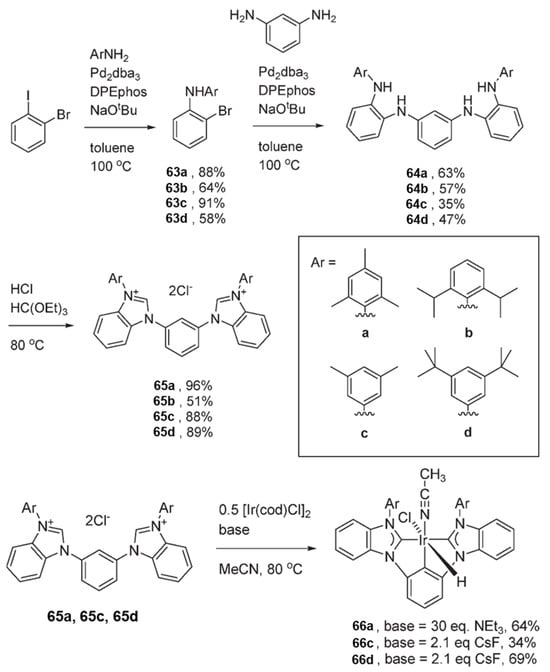 - Chianese, A.R.; Mo, A.; Lampland, N.L.; Swartz, R.L.; Bremer, P.T. Iridium Complexes of CCC-Pincer N-Heterocyclic Carbene Ligands: Synthesis and Catalytic C-H Functionalization. Organometallics 2010, 29, 3019–3026. [Google Scholar] [CrossRef]