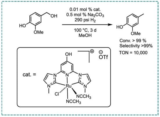 - Yao, W.; Das, S.; DeLucia, N.A.; Qu, F.; Boudreaux, C.M.; Vannucci, A.K.; Papish, E.T. Determining the Catalyst Properties That Lead to High Activity and Selectivity for Catalytic Hydrodeoxygenation with Ruthenium Pincer Complexes. Organometallics 2020, 39, 662–669. [Google Scholar] [CrossRef]