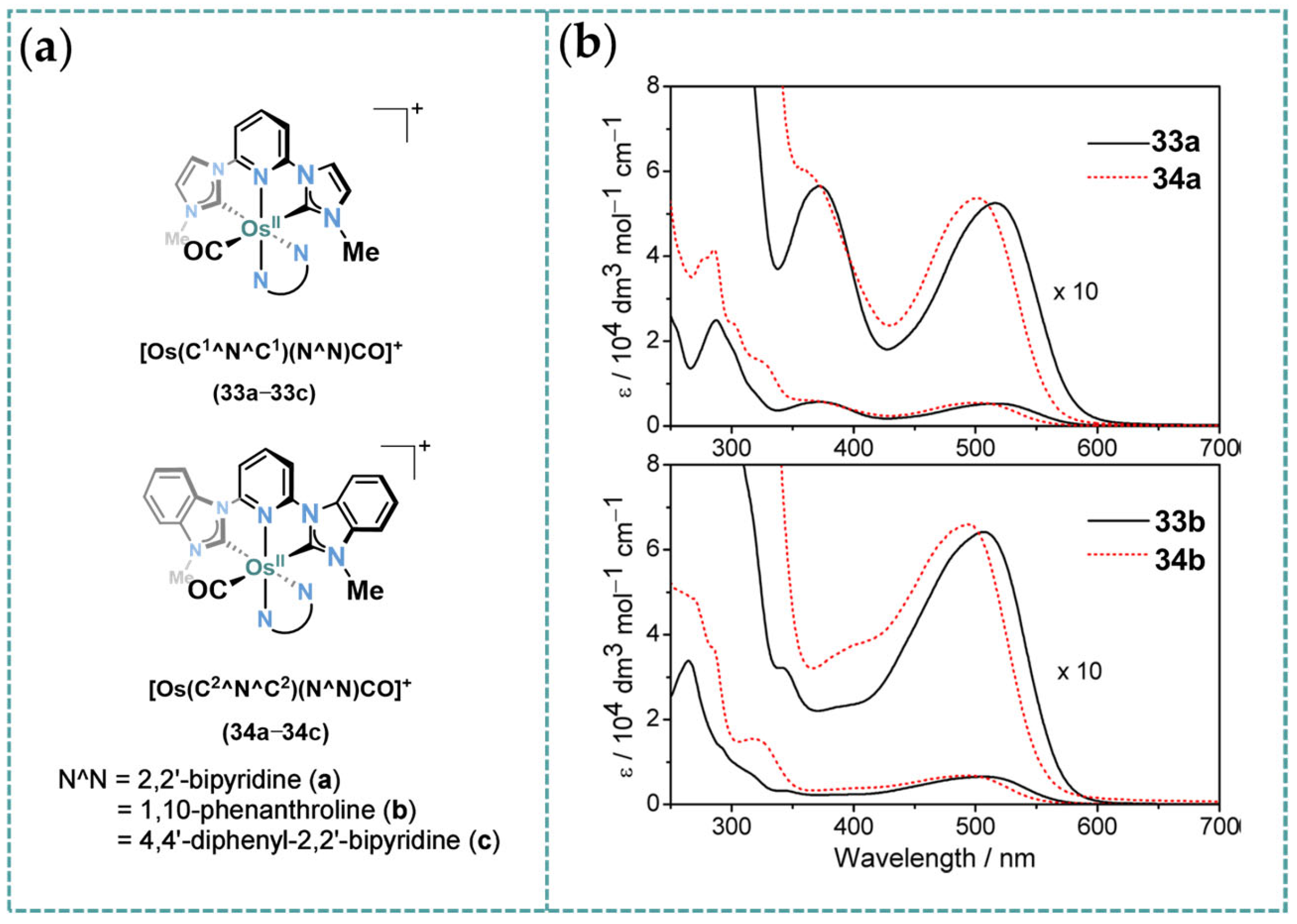 - Chung, L.-H.; Chan, S.-C.; Lee, W.-C.; Wong, C.-Y. Emissive Osmium(II) Complexes Supported by N-Heterocyclic Carbene-based C∧C∧C-Pincer Ligands and Aromatic Diimines. Inorg. Chem. 2012, 51, 8693–8703. [Google Scholar] [CrossRef]