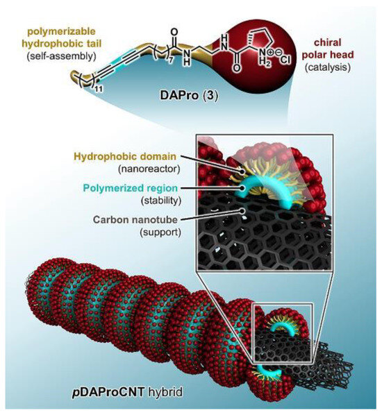 Nevertheless, the direct grafting of chiral amino acids onto CNTs presents a limitation—the relatively low ee observed in these systems. The innovative approach of using supramolecular assembly for the immobilization of proline amphiphiles on CNTs described by Doris et al. [18], as shown in Figure 1, represents a significant advancement in the field. This method allows for the creation of a hydrophobic domain at the CNT interface, which accommodates hydrophobic reactants and stabilizes the transition state, leading to improved enantioselectivity and ee varied from 46% to 98%. The resulting nanohybrid catalysts have been successfully employed in asymmetric aldol reactions in water, thereby demonstrating the potential of CNT-based organocatalysts in sustainable chemistry.