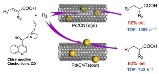 The application of CNTs in asymmetric catalysis has been further expanded to include Pd nanoparticles for the enantioselective hydrogenation of α,β-unsaturated carboxylic acids [24]. Pd nanoparticles confined within CNTs exhibited higher activity and enantioselectivity compared to those located outside the channels, with enantioselectivity as high as 92%, as shown in Figure 2. This work underscores the importance of the CNT channels in enriching reactants and chiral modifiers, thereby enhancing the catalytic performance.