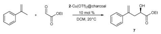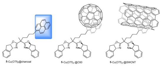 In a similar approach, Schulz et al. achieved asymmetric catalysis for the Henry reaction and ene reaction by changing the ligand and the metal [28]. In this work, two kinds of metal complexes were prepared by combining bis(oxazoline) ligand with anthracene and pyrene, respectively. Then, they were immobilized on charcoal, fullerene, and CNTs through π-π stacking, as shown in Figure 3. The ene reaction between ethyl glyoxylate and α-methylstyrene was conducted using a CNT-based catalyst, as shown in Scheme 5, achieving 64% ee and remaining at 62% after seven recycling cycles.