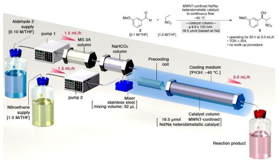 The scheme of the Henry reaction in the flow system. Adapted with permission from [32].