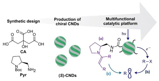 The scheme of the synthesis of (S)-CNDs and their multiple catalytic uses in (a) organocatalytic, (b) photoredox and (c) organophotoredox processes. Reproduced with permission from [57].