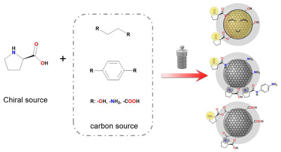 The scheme of the synthesis of chiral CDs using different carbon sources. Reproduced with permission from [59].
