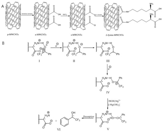 The process of L-lysine-MWCNT synthesis and the proposed pathways of asymmetric catalysis reaction. * Represents chiral carbon. Reproduced with permission from [16].