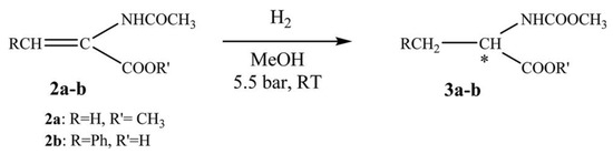 The asymmetric reaction between methyl 2-acetamidoacrylate and α-acetamidocinnamic acid. * Represents chiral carbon. Reproduced with permission from [26].