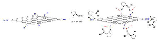 Yin et al. employed a different strategy anchoring L-proline onto GO via noncovalent method, where L-proline was loaded through hydrogen bonding and ionic interactions to provide L-proline/GO hybrid catalyst [38], as shown in Scheme 8. The hybrid catalyst was efficiently prepared by sonicating GO with L-proline in deionized water. By this method, the native structure of L-proline was preserved so that the efficiency of this hybrid catalyst was comparable to homogeneous L-proline achieved. The efficient interlayer space of the GO carrier facilitated easy access of the substrate to active sites, resulting in an excellent yield (96%) with high ee (79%) in an aldol reaction of 2-nitrobenzaldehyde with acetone. The heterogeneous catalyst retained a highly catalytic performance in seven cycles of reuse.