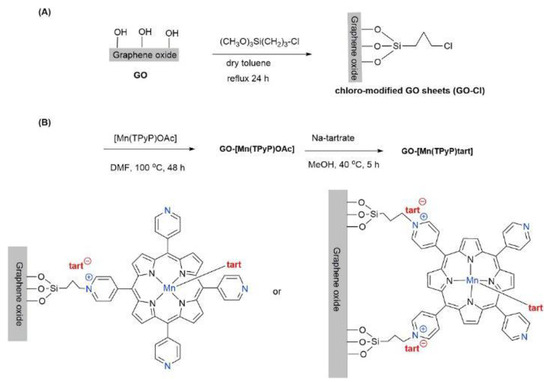The process of GO-[Mn(TPyP)tart] synthesis: (A) preparation of chloro-modified GO sheets; (B) synthesis of the GO-[Mn(TPyP)tart]. Reproduced with permission from [42].
