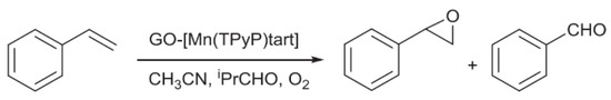 In another study, Hosseini-Monfared et al. presented a heterogeneous catalyst, GO-[Mn(TPyP)tart], which was prepared by covalently immobilizing Mn-prophyrin complex onto GO [42], as shown in Scheme 10. Similar to the study of Zou et al., the GO-[Mn(TPyP)tart] catalyst can play an important role in the asymmetric epoxidation of olefins. Full conversion with 89% epoxide selectivity and 73% ee was achieved in the catalytic epoxidation of styrene under the O2/PrCHO system and optimized conditions, as shown in Scheme 11. GO-[Mn(TPyP)tart] exhibited great recyclability with the retained yield and enantioselectivity over five cycles.