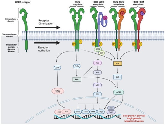 Intracellular molecular pathways due to the activation of the HER2 protein, a transmembrane receptor, after its hetero- or homo-dimerization: MAPK/ERK pathway, PIK3/AKT/mTOR pathway, and JAK/STAT pathway. Abbreviations: EGFR = epidermal growth factor receptor; HER 2/3/4 = human epidermal growth factor receptor-2/3/4; P = phosphate; L = ligand; Ras = rat sarcoma virus proteins; Braf = serine/threonine-protein kinase B-Raf (v-Raf murine sarcoma viral oncogene homolog B); MEK = mitogen-activated protein kinase; ERK = extracellular-signal-regulated kinases; GRB2: growth-factor-receptor-bound protein 2; SOS = son-of-sevenless protein; PIK3 = phosphatidylinositol 3-kinases; AKT = protein kinase B (also called PKB); mTOR = mechanistic/mammalian target of rapamycin. JAK = Janus kinase. STAT = signal transducer and activator of transcription; PLC-γ = phospholipase C-gamma; PKC = Protein Kinase C; c-Fos = cellular oncogene fos; c-Jun = cellular homolog of the viral oncoprotein v-Jun; c-Myc = homology with the viral gene v-myc; CREB = cAMP Response Element-Binding Protein; S6K = Ribosomal protein S6 Kinase; FoXK1 = Forkhead box protein K1. Created using biorender.com.