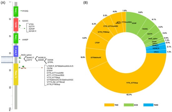 The second most frequent mutations are the HER2 mutations in the extracellular domain (ECD) (~21%); the most recurrent are S310F (8.8%), D277Y (3.2%), and X633_splice (2.6%). Many reports document that mutations in the ECD of the HER2 are oncogenic and are associated with sensitivity to treatment with HER2 inhibitors (Table S2) [52].
