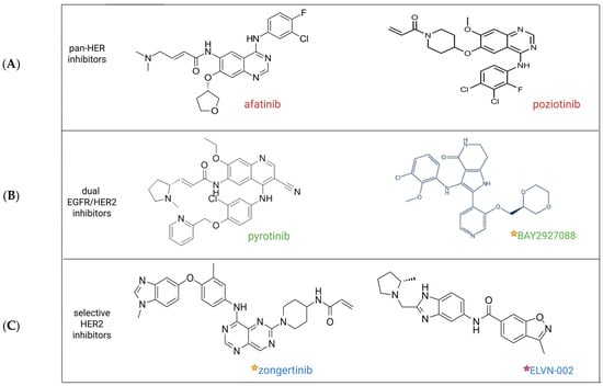 New promising HER2-selective TKIs are under investigation, such as ELVN-002, which we will discuss later in a dedicated section. Figure 3 illustrates the chemical structure of the three categories of TKIs, providing some examples. Furthermore, Table S3 summarises the characteristics of these drugs.