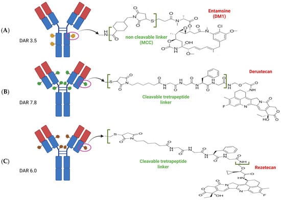 Illustration of antibody–drug conjugates (ADCs) investigated in HER2-altered NSCLC. (A) Trastuzumab emtamsine (TDM1), a second-generation ADC. (B) Trastuzumab deruxtecan (TDXd), a third-generation ADC (C) Trastuzumab rezetecan (SHR-A 1811), another third-generation ADC. Created using biorender.com.