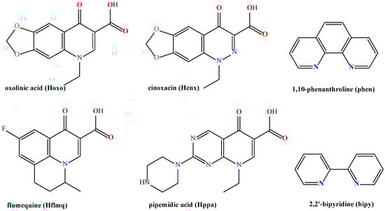 The syntax formula of the quinolones oxolinic acid (Hoxo), flumequine (Hflmq), cinoxacin (Hcnx), and pipemidic acid (Hppa) and the N,N′-donors 1,10-phenanthroline (phen), and 2,2′-bipyridine (bipy) used in the present study.