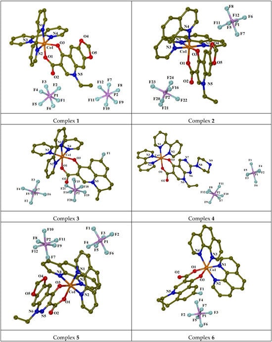 Complexes 1 and 4 crystallized in the triclinic system and space group P-1 (Table S1), while complexes 2, 3, 5 and 6 crystallized in the monoclinic system and space groups P21/c (for 2, 3 and 6) or P21/a (for 5). The crystal structures of mononuclear complexes 1–6 are displayed in Figure 2, and selected angles and bond lengths are summarized in Table 1 and Table S2. Compounds 1–5 are Co(III) complexes and 6 is a Co(II) complex.