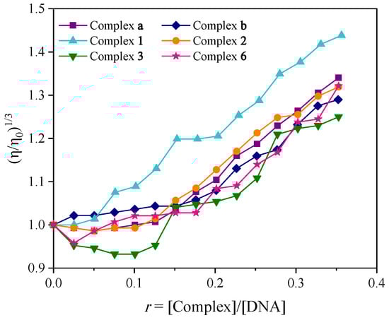 Relative viscosity (η/η0)1/3 of CT DNA (0.1 mM) in buffer solution (150 mM NaCl and 15 mM trisodium citrate at pH 7.0) in the presence of the complexes at increasing amounts (r = [complex]/[DNA]).