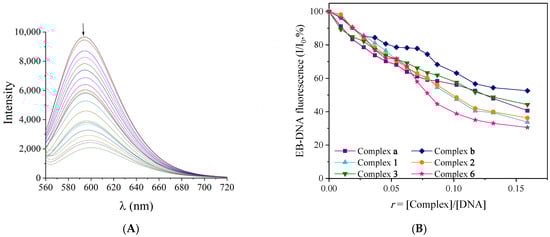 (A) Fluorescence emission spectra (λexc = 540 nm) for EB-DNA in buffer solution (150 mM NaCl and 15 mM trisodium citrate at pH 7.0) in the absence and presence of increasing amounts of complex 1. (B) Plot of EB-DNA relative fluorescence intensity at λem = 592 nm (I/I0, %) vs. r (r = [complex]/[DNA]) for the compounds (up to 40.6% of the initial EB-DNA fluorescence intensity for a, 52.6% for b, 30.0% for 1, 26.6% 2, 35.5% 3, and 27.8% 6).