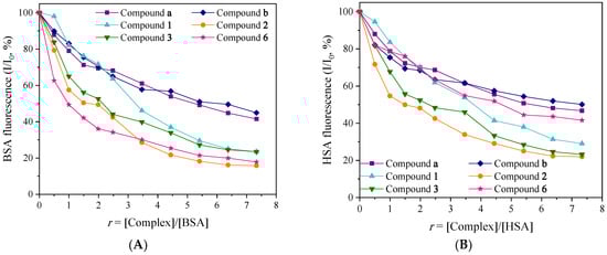 (A) Plot of relative fluorescence emission intensity of BSA at λem = 348 nm (I/I0, %) vs. r (r = [complex]/[BSA]) for the complexes (up to 23.5% of the initial BSA fluorescence for 1, 15.8% for 2, 23.5% for 3, 17.8% for 6, 41.5% for a, and 44.9% for b) in buffer solution. (B) Plot of relative fluorescence emission intensity of HSA at λem = 342 nm (I/I0, %) vs. r (r = [complex]/[HSA]) for the complexes (up to 29.7% of the initial HSA fluorescence for 1, 23.0% for 2, 23.2% for 3, 41.6% for 6, 46.7% for a, and 50.1% for b) in buffer solution.