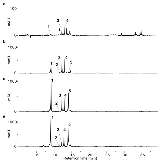 HPLC-UV chromatograms at 330 nm of ethanol extracts from samples A-D. (a) Sample A, upscaled 10-fold to enhance peak visibility; (b) sample B; (c) sample C; (d) sample D. The numbered peaks correspond to the following compounds: chlorogenic acid (1), cynarin (2), scolymoside (3), cynaroside (4), methyl chlorogenate (5).