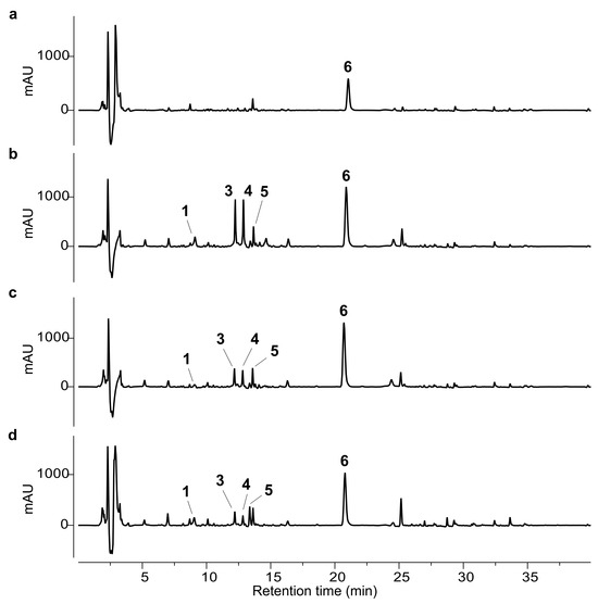 HPLC-UV chromatograms at 210 nm of ethanol extracts from samples A–D. (a) Sample A; (b) sample B; (c) sample C; (d) sample D. The numbered peaks correspond to the following compounds: chlorogenic acid (1), scolymoside (3), cynaroside (4), methyl chlorogenate (5), and cynaropicrin (6).