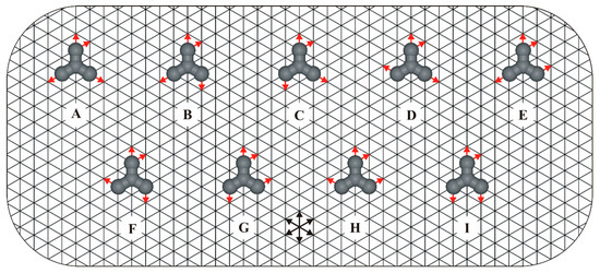 Family of star-shaped regioisomers (A–I) adsorbed on a triangular lattice. For clarity, only one surface enantiomer (R) is shown for each prochiral admolecule. Red arrows placed on the molecular arms indicate the positions of interaction centers responsible for the formation of linear (), reversible intermolecular bonds. Equivalent directions of the underlying triangular lattice are marked with intersecting black arrows.
