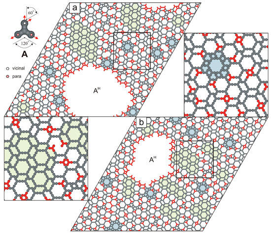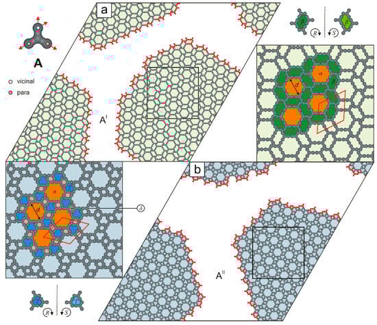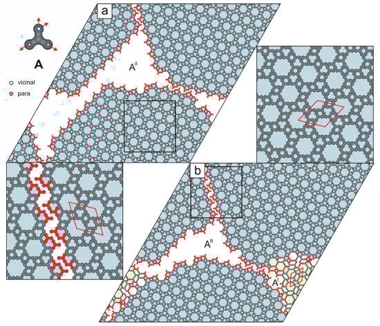 As shown in Figure 3a, the defect-free network AI () consists of two types of nanopores: achiral hexagonal voids (19 free adsorption sites, diameter , measured corner-to-corner) and R-chiral cavities (each comprising 6 adsorption sites). This biporous network possesses a centrosymmetric rhombic unit cell (). In this double-walled phase, all tetratopic molecules are interconnected exclusively via the pp-pp-vvv mode: each para (p) FG of a tecton A is bonded to a para (p) FG of another molecule, while its vicinal (v) FGs interact with vicinal (v) FGs of two neighboring molecules. This concise shorthand notation will be used throughout the text.
