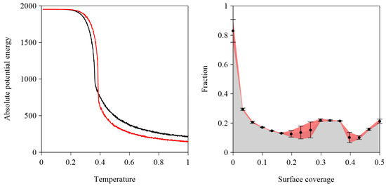 (left panel) Effect of temperature on the absolute potential energy of the competing polymorphs AI (solid red line) and AII (solid black line) illustrated in Figure 3. The presented data are averages from 10 independent system replicas. (right panel) Effect of surface coverage on the fraction of under-coordinated molecules A. The black dots represent averages from ten independent system replicas for each value. Vertical black bars indicate standard deviations.