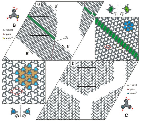 Like molecule A, the next investigated tectons, B and C, also proved to be network-forming. In particular, the supramolecular architecture formed by molecules B (Figure 6a) is more intricate than the highly ordered networks generated by molecules A (Figure 3). The discussed overlayer is composed of patches of ordered network (, , pv-mRv-vmRp), interconnected by the rows of R-chiral voids and achiral cavities .