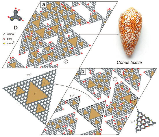 Interestingly, the overlayer depicted in Figure 7a bears a striking resemblance to the staircase mosaic pattern found on the shell of the venomous sea snail Conus textile [26]. This similarity mainly arises from the presence of undirected, variably sized voids that form a reticulated pattern composed of repeating geometrical motifs. In this context, molecule D can be regarded as a molecular analogue of Stephen Wolfram’s cellular automata governed by rules 30 and 110 [27]. Moreover, the aperiodic mosaic depicted in Figure 7b is complemented by closed supramolecular aggregates resembling successive iterations of the deterministic fractal known as the Sierpiński triangle (ST) [28]. Notably, these Sierpiński-like triangles are not only visually striking but also structurally scalable. For instance, the th ST iteration (where ) consists of molecules D, contains empty pores , and includes /2 triangular voids in total.