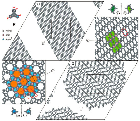 Ordered polymorphs (a) EI and (b) EII comprising 1000 molecules E, each. The top-left inset shows molecule E with a color-coded distribution of interaction centers. Solid red lines outline the networks’ unit cells, while dashed black lines indicate planes of symmetry. Pores , , , and are color-coded.