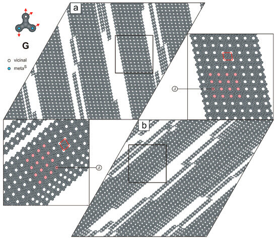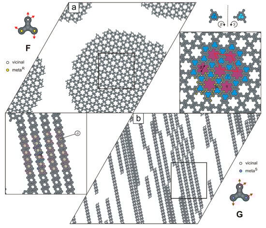 Adsorbed overlayers comprising (a) 1000 molecules F and (b) 1000 molecules G, respectively. Molecules F and G, with color-coded distribution of interaction centers, are shown in the top-left and bottom-right insets, respectively. A solid red line outlines the rhombic unit cell, while the dashed black line indicates a plane of symmetry. Pores , , and are color-coded.