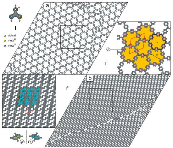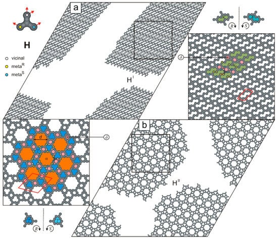 (a,b) Ordered polymorphs comprising 1000 molecules H, each. The top-left inset shows molecule H with a color-coded distribution of interaction centers. Solid red lines outline unit cells of the networks, and dashed black lines indicate planes of symmetry. Pores , , and are color-coded.