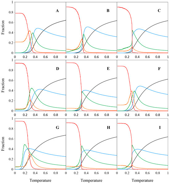 Effect of temperature on the fraction of molecules A–I with – neighbors in the studied systems (). For each molecule, data are averaged over 10 independent system replicas. Color codes: (black), (blue), (green), (orange), and (red).