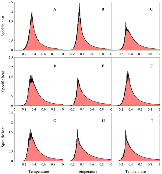 As shown in Figure 14, all specific heat curves are relatively smooth at temperatures , indicating low potential energy fluctuations in this range. Moreover, each curve rises monotonically as the temperature decreases, reaches a more or less sharp peak corresponding to the lattice gas-ordered phase transition, and then rapidly decreases. Finally, at , potential energy fluctuations almost completely vanish. This is not surprising, since the studied molecules (A–I) are positional isomers, with each possessing four sterically accessible FGs.